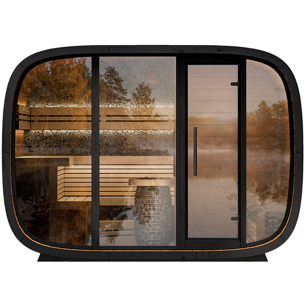 Combining high-quality materials, including an eye-catching mirror glass effect, the Quietude Cube Outdoor Cabin Sauna With Changing Room (L-Bench) series captivates with its distinctive shape and visually striking appearance. Each detail is meticulously crafted to ensure an unparalleled wellness experience, from the soothing scent of juniper walls to the ergonomic 3-step aspen bench and efficient air circulation.