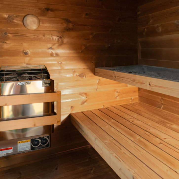 Built from thermo-treated wall logs and finished with a durable EPDM rubber roof system, Scandinavian Halo 3-Person Outdoor Cabin Sauna (7x5) is engineered for reliable, year-round outdoor use. A thoughtfully planned bench system (top + two lower benches) supports comfortable seated sessions, while integrated ventilation provisions help maintain proper airflow during use.
