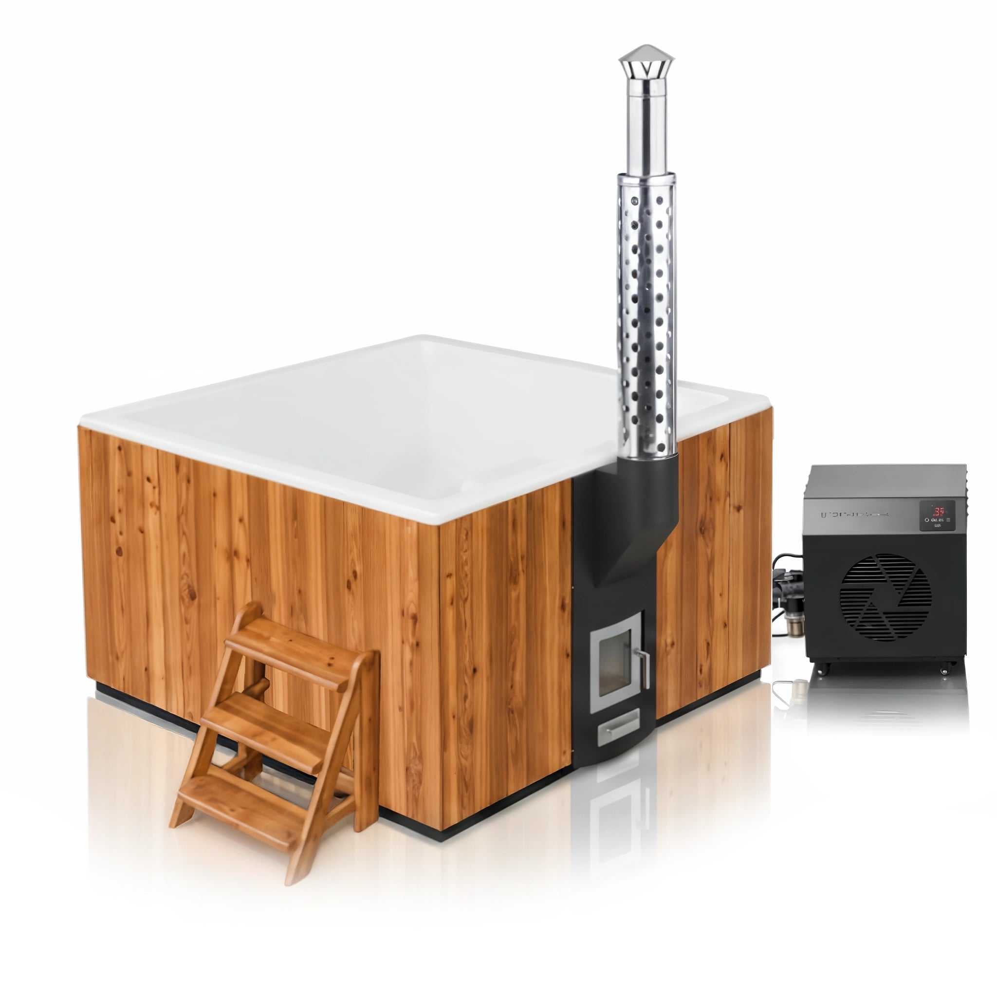 Our Scandinavian Elite Hybrid Wood-Fired Hot Tub & Cold Plunge – with LED & Aeromassage (2–4 Person) is one of our most spacious, powerful and luxurious model of all. Transform your outdoor space into a place of peace and relaxation with the most modern & robust wood-fired hot tubs on the market.